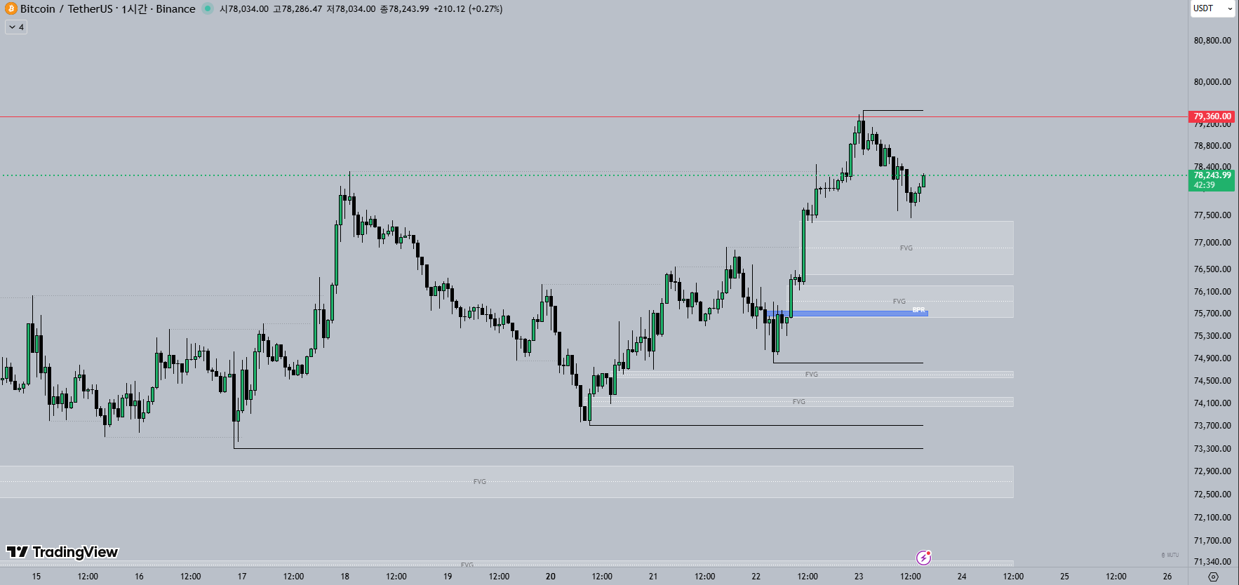 현재 1시간봉은 $79,360 고점 터치 이후 약한 조정을 보이며 박스권을 형성 중입니다. 하단에 파란색 블록으로 표시된 $75,600 레벨은 이전에 가격 상승을 견인했던 강력한 Balanced Price Range(BPR)로, 가격이 하락하더라도 지지받을 확률이 매우 높은 거시적 진입 타점 역할을 합니다.