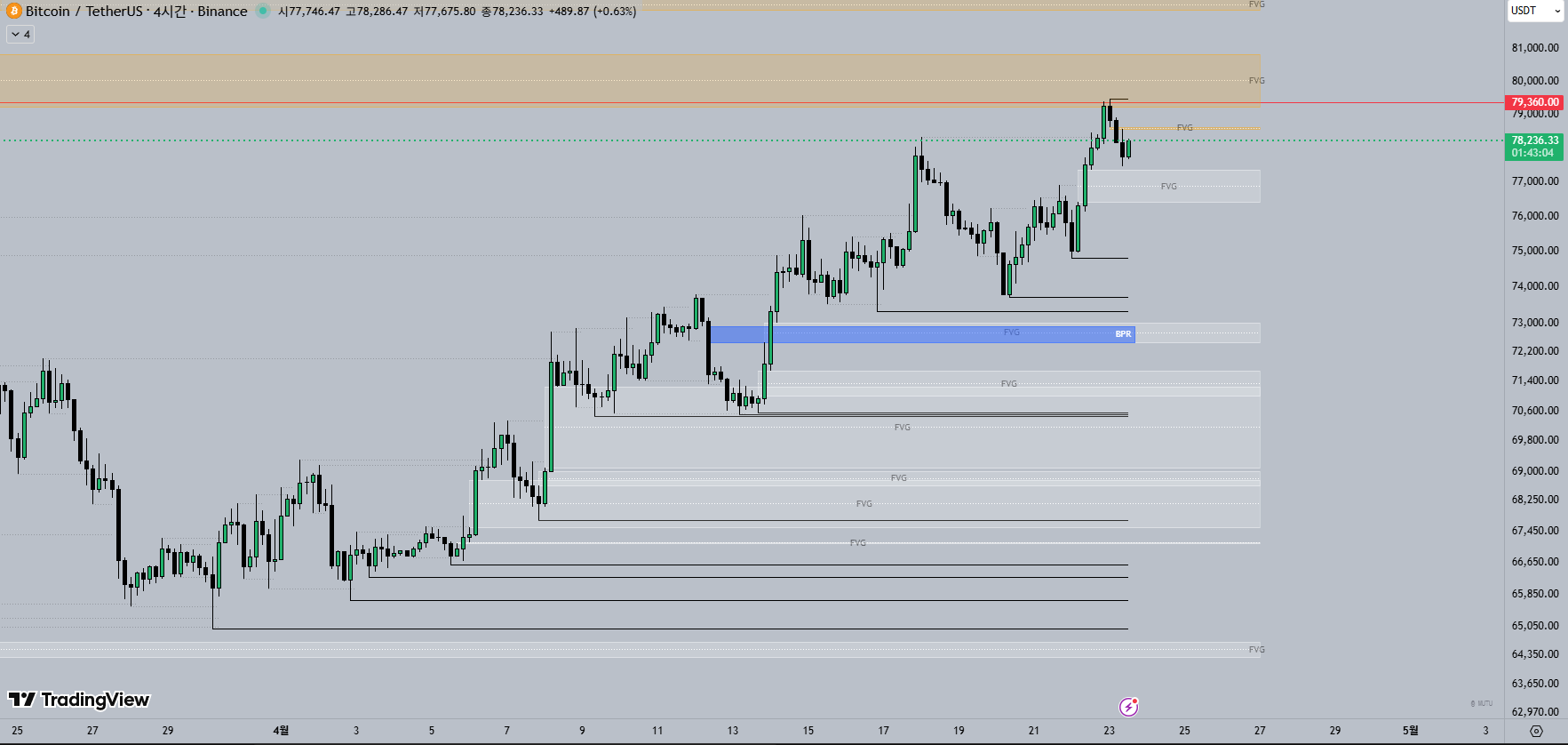 #비트코인분석 #BTC분석 #비트코인오늘 #ICT분석 #SMC분석 #스마트머니 #딜링레인지 #뉴욕킬존 #JudasSwing #BPR #FVG #ChoCH #MSS #OB #BSL #SSL #FairValueGap #$79360 #$78150 #$77600 #비트코인롱 #비트코인숏 #20260423