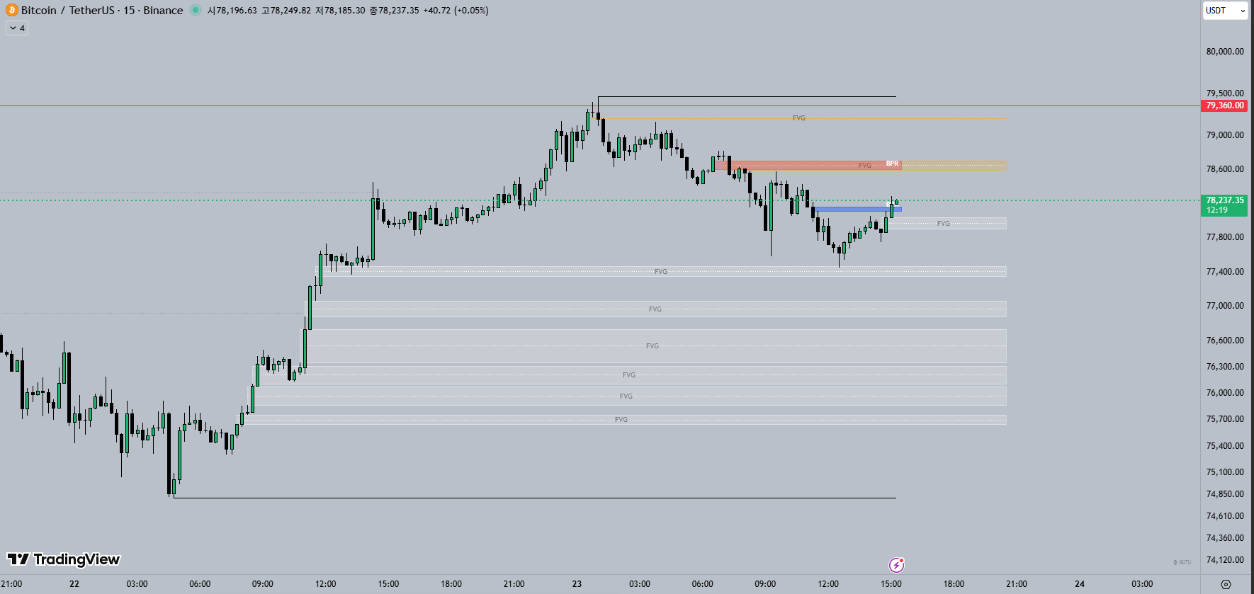 | 접근 구간 | $78,100 ~ $78,250 (15M 파란색 FVG 수요 구간 지지 확인 시) |