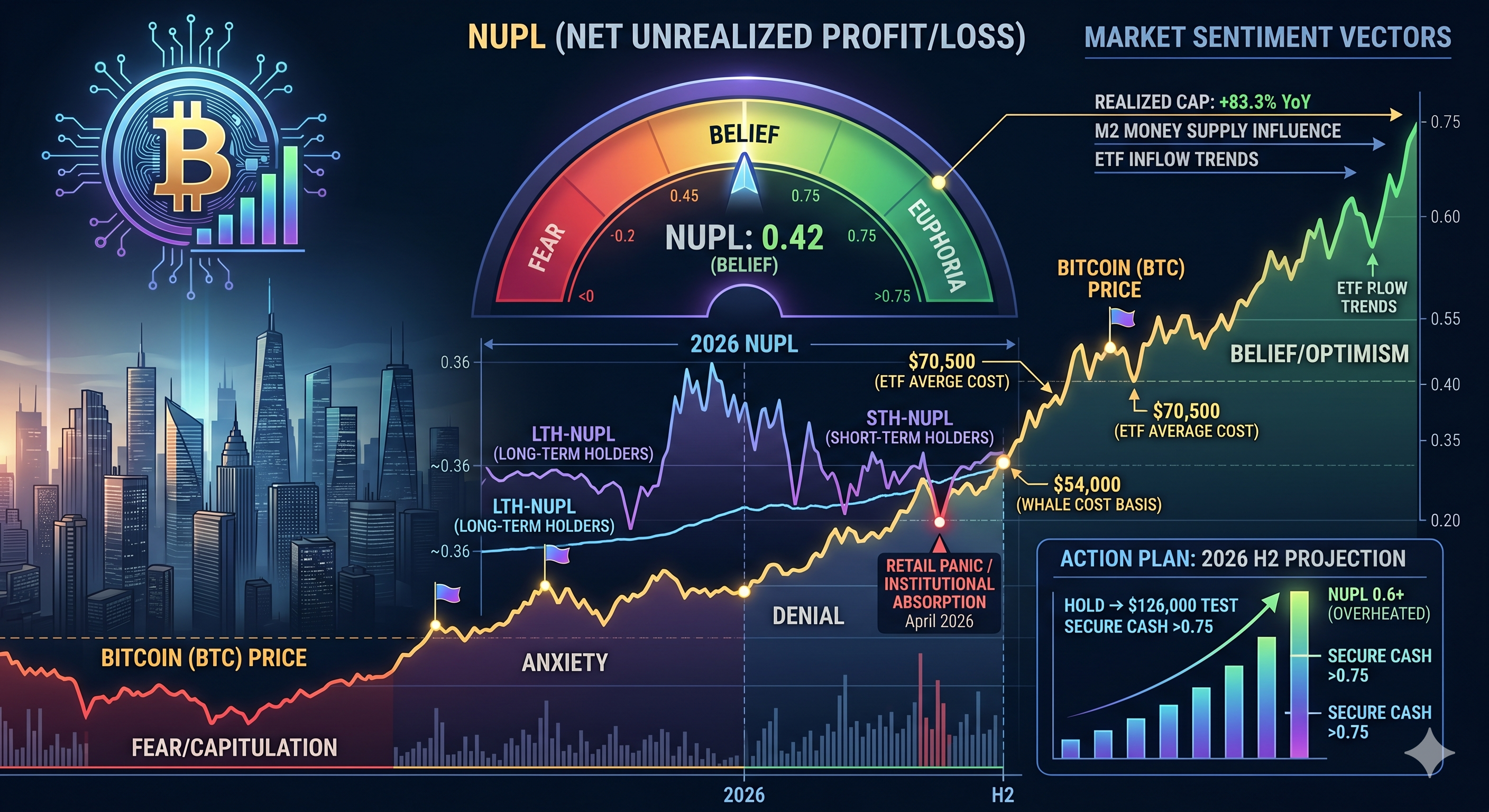 결론부터 말하자면, NUPL은 시장의 모든 구성원이 보유한 자산의 현재 가치에서 취득 당시의 가치를 뺀 순이익을 전체 시가총액으로 나눈 비율입니다. 이 지표의 핵심 원인은 투자자들이 '미실현 이익' 구간에 진입했을 때 나타나는 안도감이 특정 임계점을 넘어서면 '차익 실현 욕구'라는 탐욕으로 변질된다는 데 있습니다. Glassnode의 2026년 4월 실시간 관측에 따르면, 현재 비트코인 NUPL 지수는 0.45를 기록하며 '신뢰(Belief)' 구간의 상단에 위치해 있습니다. 이는 시장 참여자의 약 45%가 잠재적 수익 상태에 있음을 의미하며, 역사적으로 이 수치가 0.7을 상회할 때 광적인 탐욕이 발생했습니다. 필자는 2024년 반감기 직후의 데이터와 현재를 비교했을 때, 유동성 공급의 질적 변화로 인해 지표의 변동성이 과거보다 완만해졌으나 그 신뢰도는 더욱 높아졌다는 점을 확인했습니다.